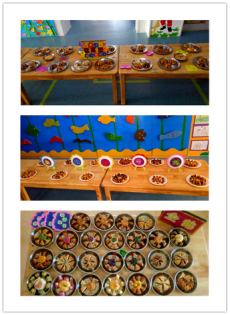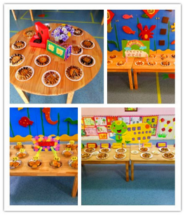 每位小朋友从家中带来了一些美味的月饼,有豆沙的、芝麻的、五仁的、莲蓉的、蛋黄的、牛肉的、草莓的……教师将月饼按班级进行分类切块摆盘,布置在幼儿园的大厅,等待幼儿的品尝。